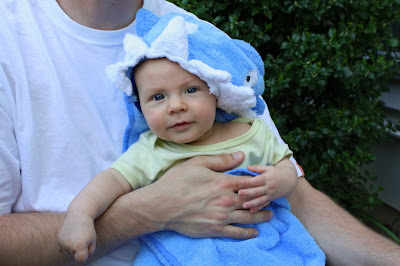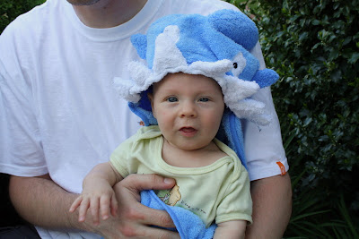 I took some photos of Dylan in his little blue shark towel yesterday. However, the pictures don’t quite capture the look. I think he looks like a little mix of shark, the Statue of Liberty, and a character out of a Dr. Seuss book! Either way, he is quite the catch!