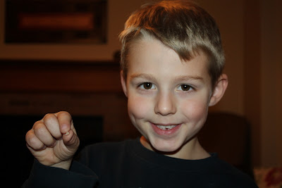 Friday evening, November 5, 2010, there was a lot of celebrating and jumping up and down in our home. Cody lost his first tooth! He was brushing his teeth when he noticed “something” fall into the sink (thankfully, not down the drain!). He questioned what it could be, “Wait a minute…” Then he was just bursting with joy, elated, to discover it was his tooth! He kept saying he was a lucky boy and requested I make tooth pancakes the next morning! I made the pancakes, but Shawn, since we were short on tooth cookie cutters (smile), sweetly cut out tooth shapes for our breakfast. Cody asked if we could have spaghetti, so he could slurp the noodles through his new gap. Oh, and juice boxes, as well, so he can stick the straw through his hole. He has been so happy about this that he surprised me on Sunday morning when he told me, with tears in his eyes, on our way to church that he really wanted to tell his Sunday school teacher about his first missing tooth, but he was afraid the other children would find out and he might feel silly. He was afraid he would be the only one without a tooth. Ugh, these are the things that tear at a Momma’s heart. I told him Heaven, his friend, just lost a tooth and his friend Michael had. I was sure a lot of the children were missing some teeth. That morning he did tell his teacher. How could he not? He has loved this teacher so much, and she has played such a huge role in his life these past 2 years. He adores her. I was glad he told her that morning, but he did tell me he was afraid a girl next to them heard. Now that he is home again he keeps telling us how lucky he is! Aww…childhood…and all the mixed emotions and learning and building of confidence that goes with it…I love your new grin, Cody!