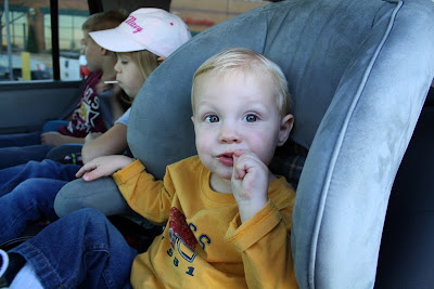I took Dylan this evening to get his first haircut. He cried in the booster seat, so I had to hold him in my lap. He still shed a few tears, but some Smarties (a favorite candy of his) helped calm his fears. He seemed to like the electric shaver on his neck and ears, though. It may have reminded him of Shawn’s electric razor at home. He loves that thing, and pretends to shave his chin with Shawn! Dylan looked so much older after his haircut. The lady who cut his hair took a picture for us. It was a little blurry, so I took a couple more of Dylan once he got into the car to go hoome. His reward from the hair stylist…a sucker. He is looking quite stylish!